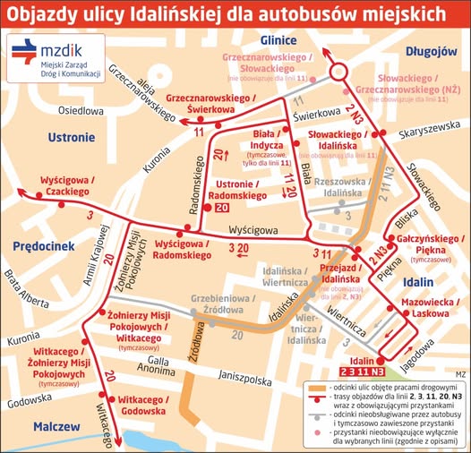 W związku z przebudową ulicy Idalińskiej, od dnia 4 października 2025 roku (sobota) będą zamknięte dla ruchu kołowego odcinki między ulicami Słowackiego a Wyścigową i między Wyścigową a Źródłową. Zostaną wprowadzone objazdy dla autobusów linii 2, 3, 11 i N3, a ponadto pozostanie utrzymany objazd dla linii 20. Dojazd do Domu Kultury Idalin wyłącznie od ulicy Białej.